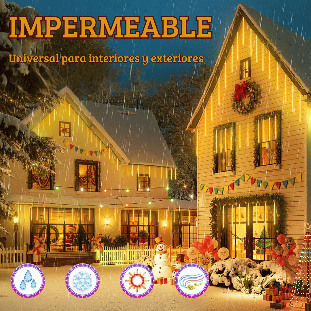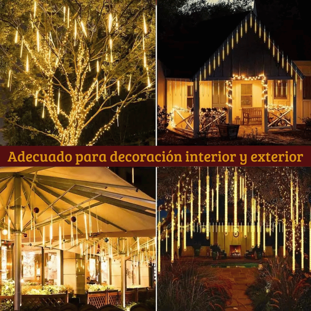 Cada tubo simula meteoros cayendo para un look navideño elegante, visible desde cualquier ángulo.