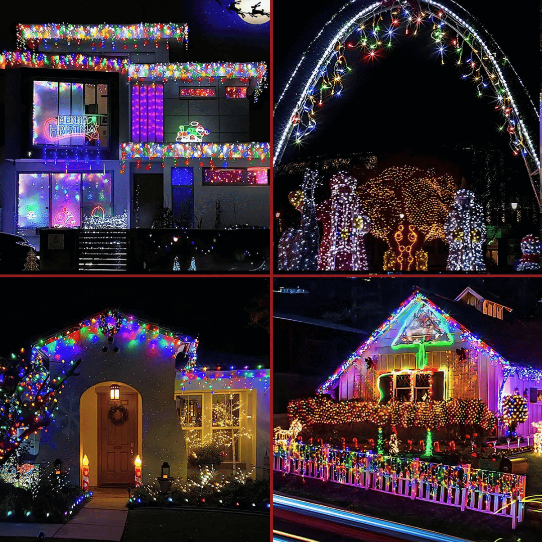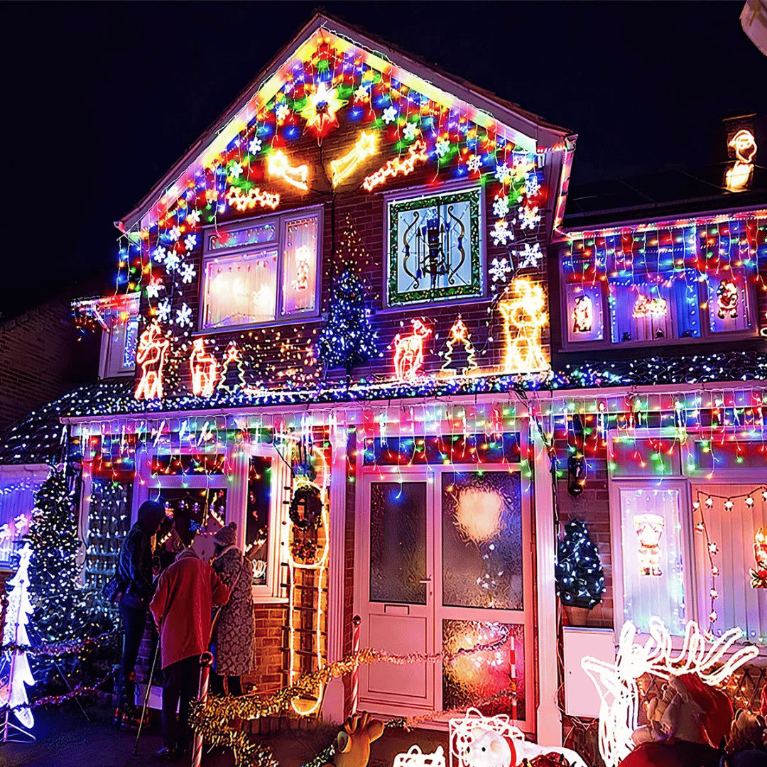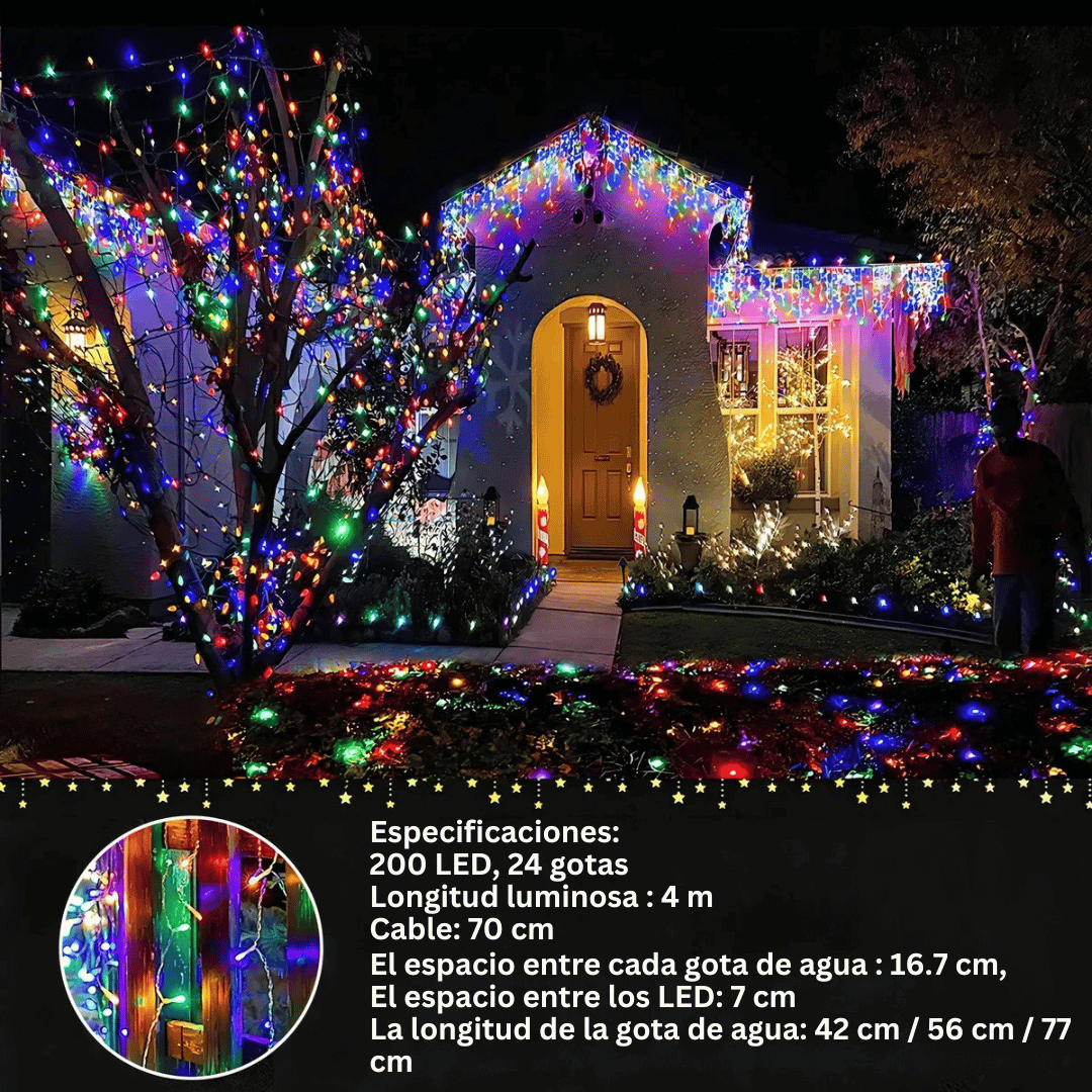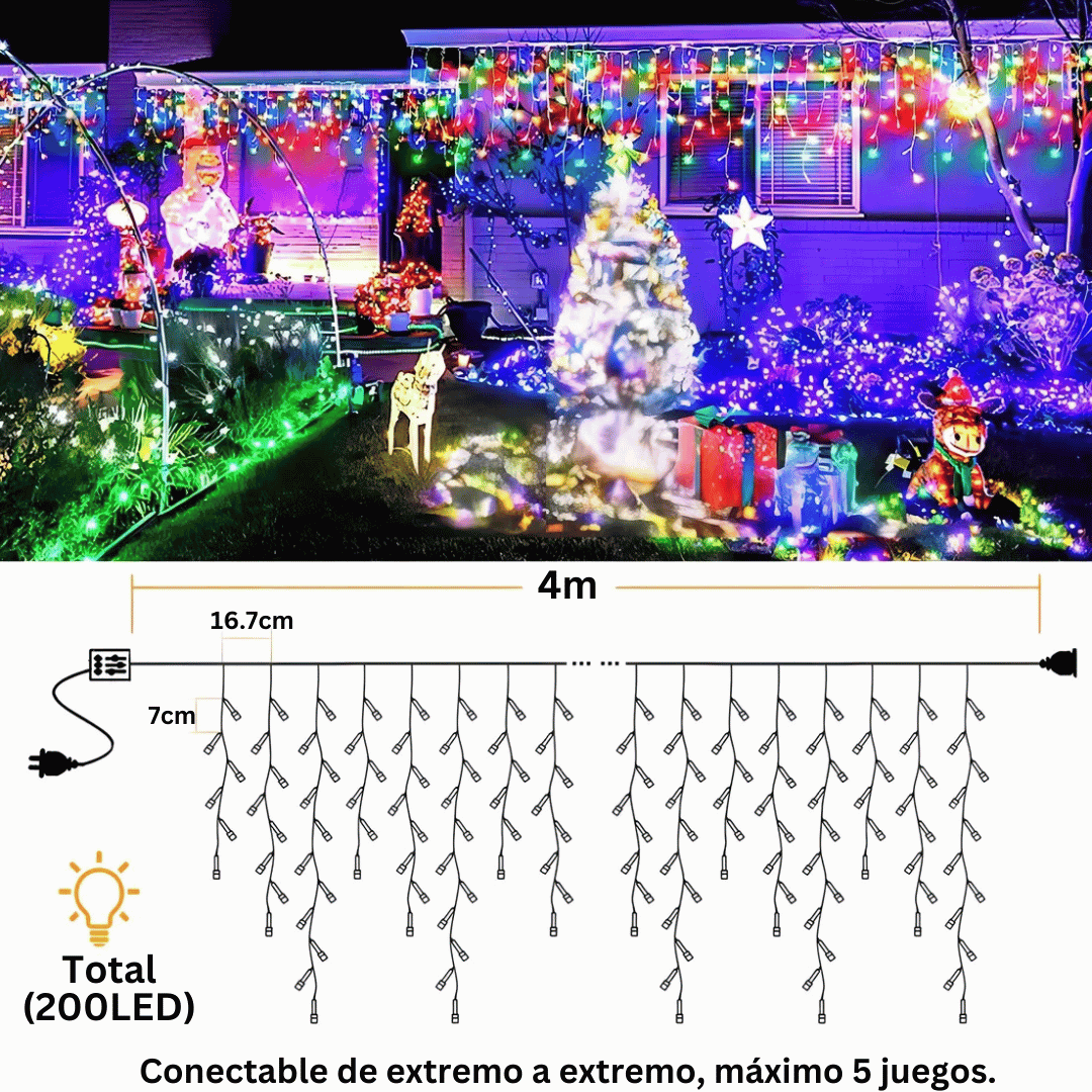 Ilumina tu casa con un efecto cascada visible desde la calle. Los 200 LED distribuidos a lo largo de 4 m crean un espectáculo uniforme que atrae miradas y fotos —ideal para ser “la casa favorita” del vecindario.